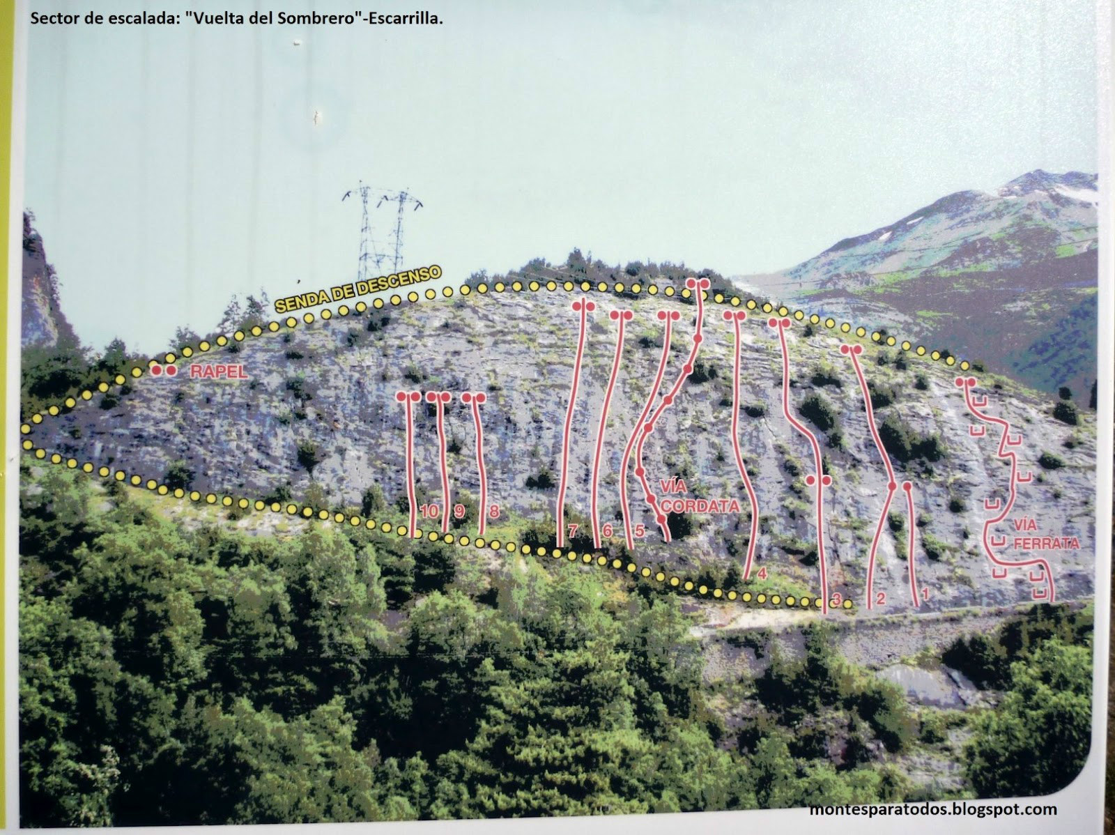 Via ferrata y escalada a las afueras de Escarrilla, en el Valle de Tena: Hay un sector con vías de 4 grado máximo, y via ferrata y cordata, en el túnel de Escarrilla que da acceso a Formigal. La via ferrata es sencillita, con numerosas grapas. Tendrá unos 35 metros de escensión. La hice yo de primero y luego colgue la cuerda y la hizo mi hijo Alvaro, con 7 añitos... La "vía cordata" posee mosquetones ya puestos para asegurarse...
