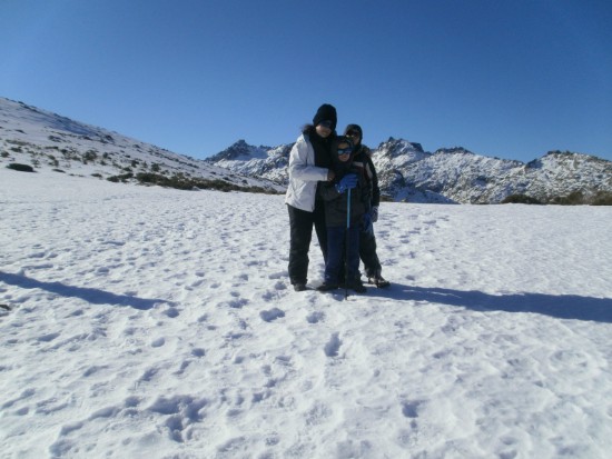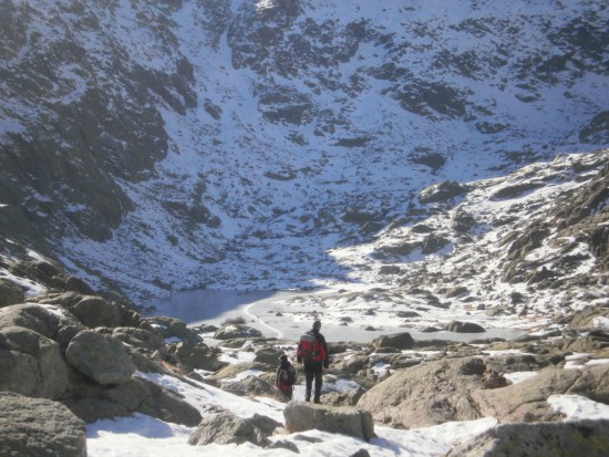 Y aquí paramos un buen ratito, panteándonos si nos quedamos ya aquí o nos arriesgamos a ir a la Laguna grande de Gredos. La incertidumbre es el hielo, pues en algún momento en Los Barrerones hemos tenido algunos pasitos con algo de hielo. Además, tenemos que bajar a los 200 metros, y luego todo lo bajado tendremos que subirlo de vuelta.... Pero vemos a una familia como nosotros, que ha hecho el mismo camino con sus niños, y tira para adelante. Además, el lugar donde normalmente suelen existir problemas de hielo es en los Barrerones, y ya los hemos pasado.
