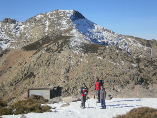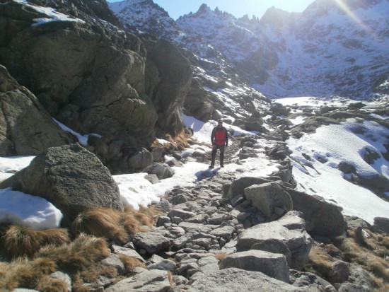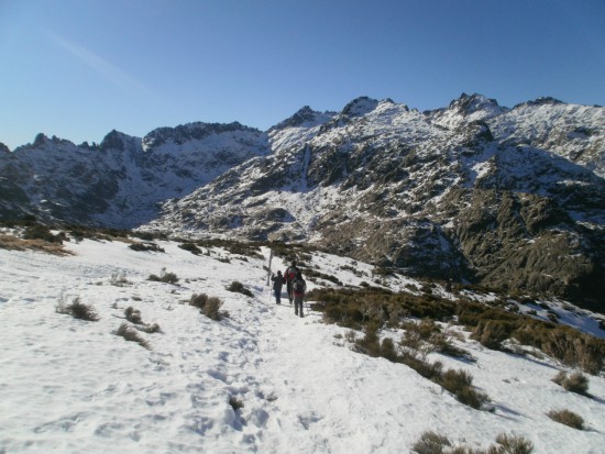 Y tras el descanso, seguimos la subida, aunque con mucho cuidado, pues hay hielo en el camino, y hay que ir yendo por los laterales, donde hay roca... Pero, pasito a pasito, y con cuidado, vamos llegando al alto de los Barrerones (a unos 2200 m), donde aparecen de pronto las cimas del circo de Gredos. Ya hemos llegado a la cota máxima de esta ruta, y hemos superado unos 450 metros de desnivel desde la plataforma.
